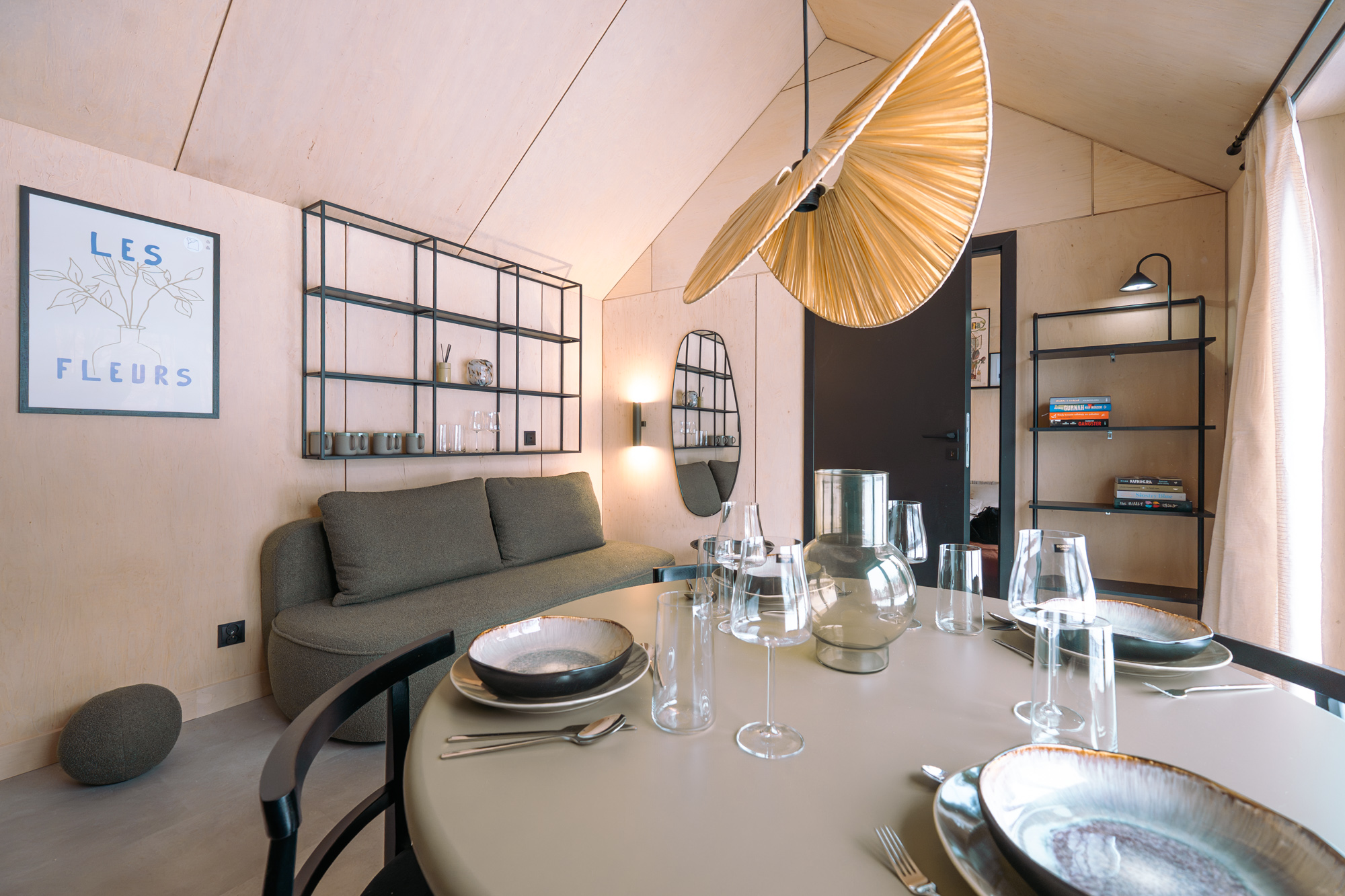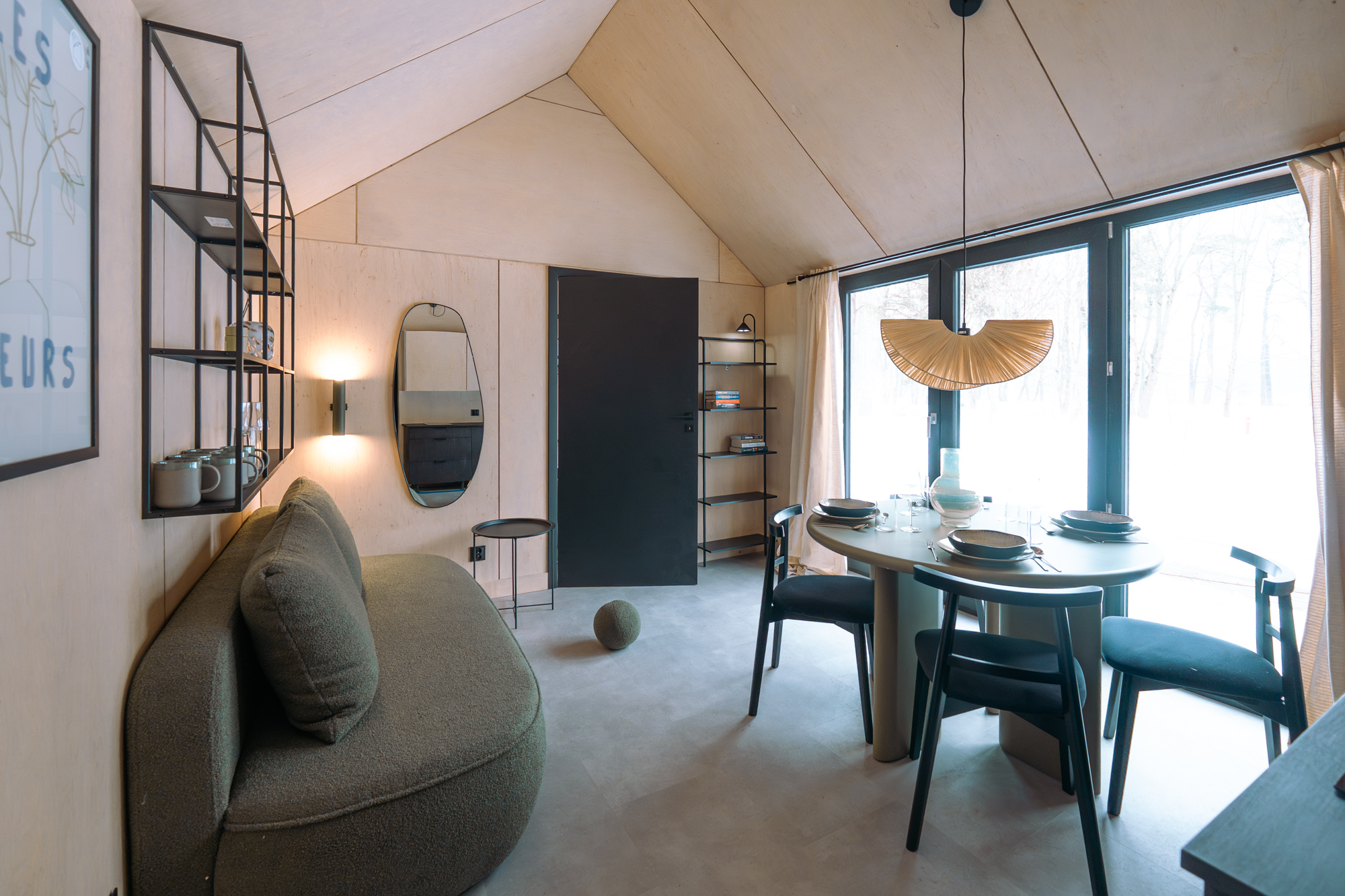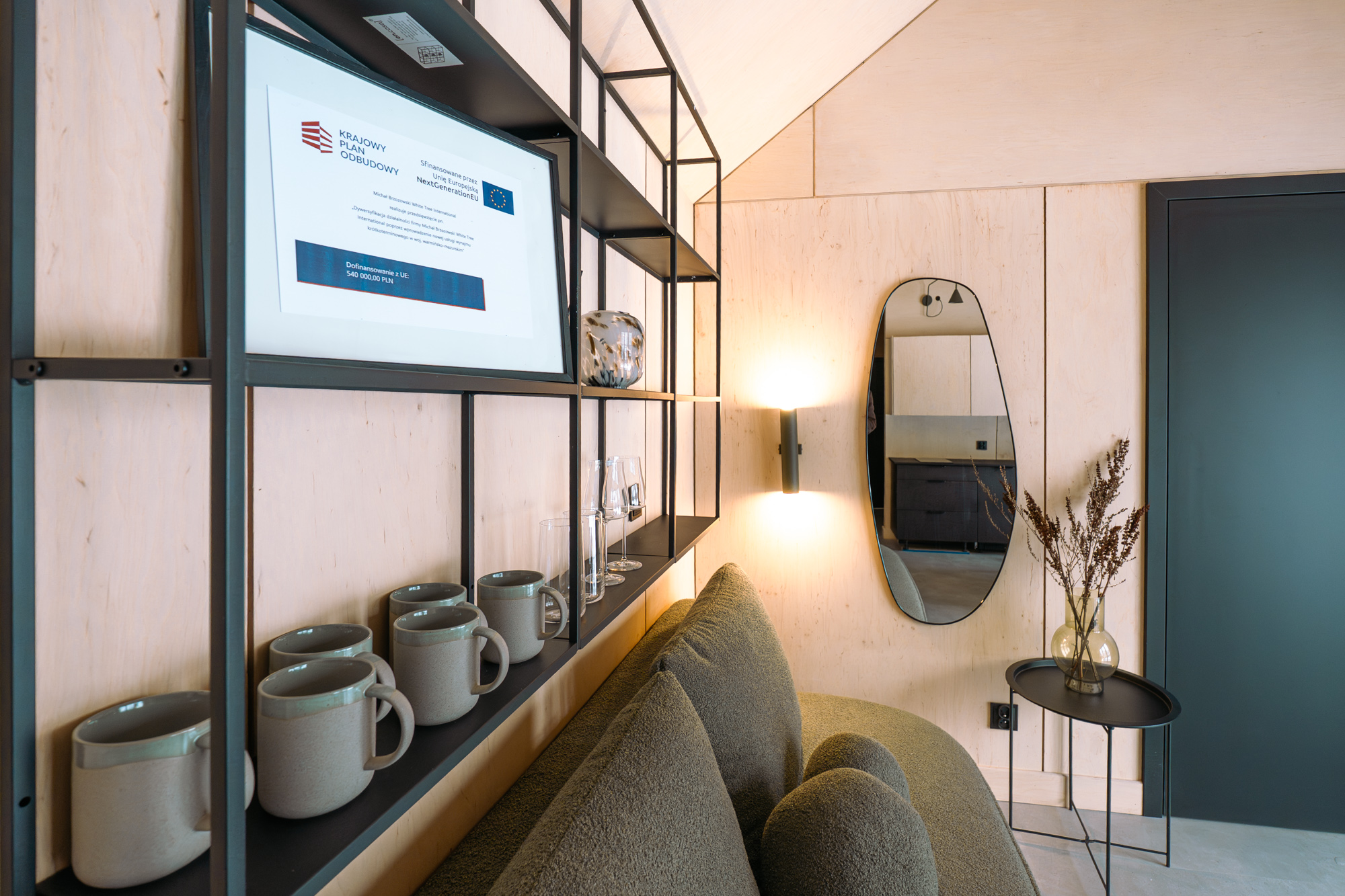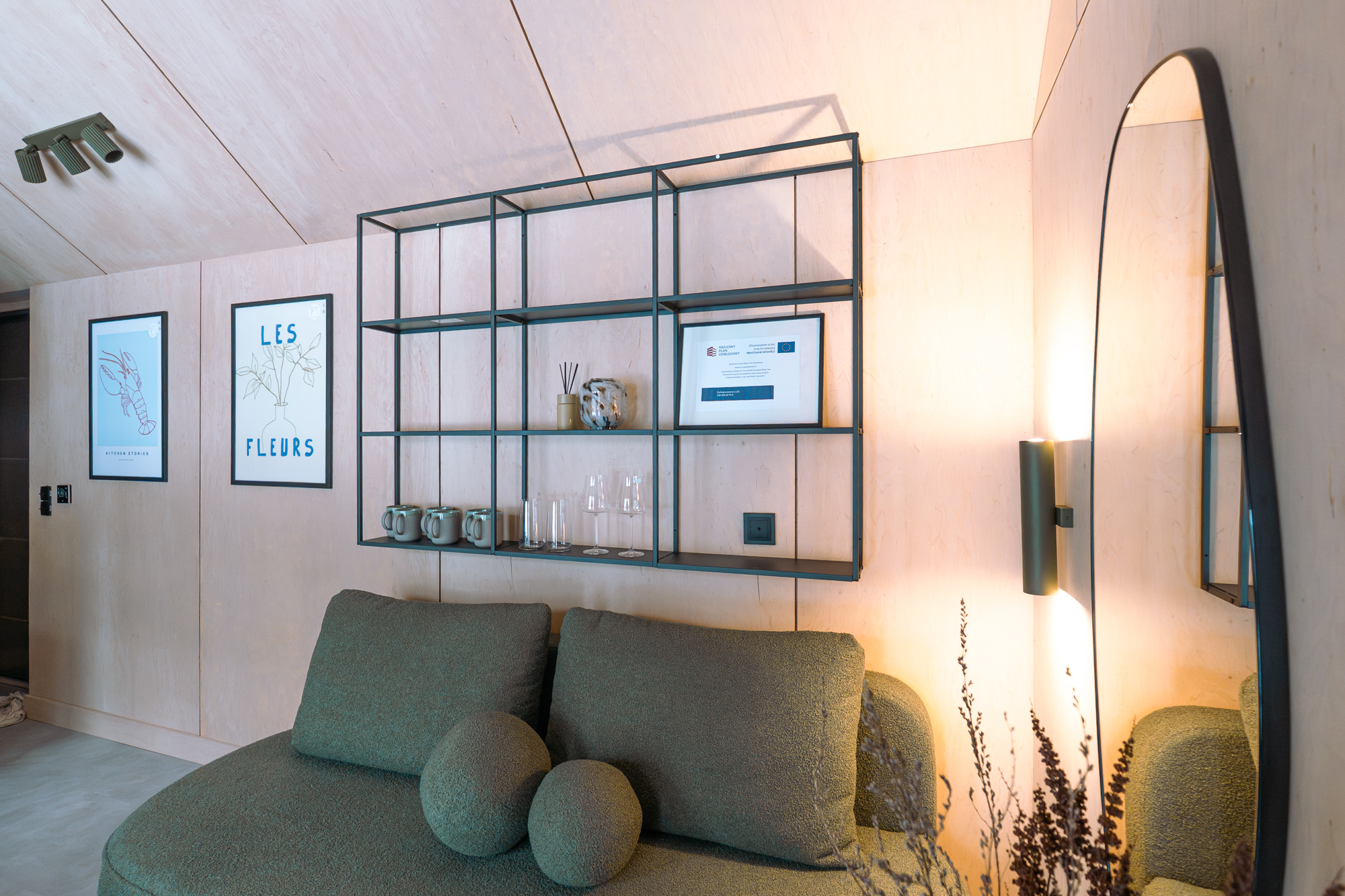 Wnętrze zostało zaprojektowane przez Studio Projektowe Miseko z dbałością o poczucie przestrzeni i harmonii. Cała koncepcja kolorystyczna organicznie opiera się na barwie szałwii.